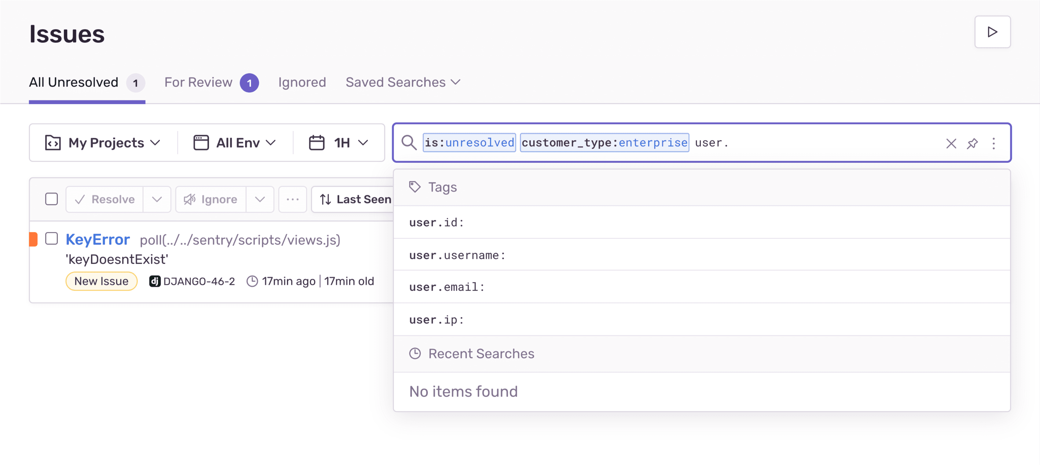custom tags,user contextattributes, andreleaseids in the issue search bar.