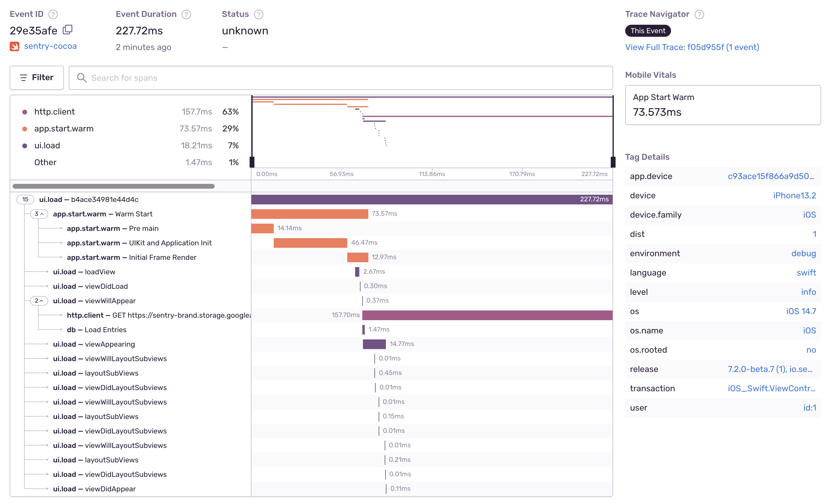 In the example below, the detail view of a transaction displays the warm start measurement in the right sidebar.