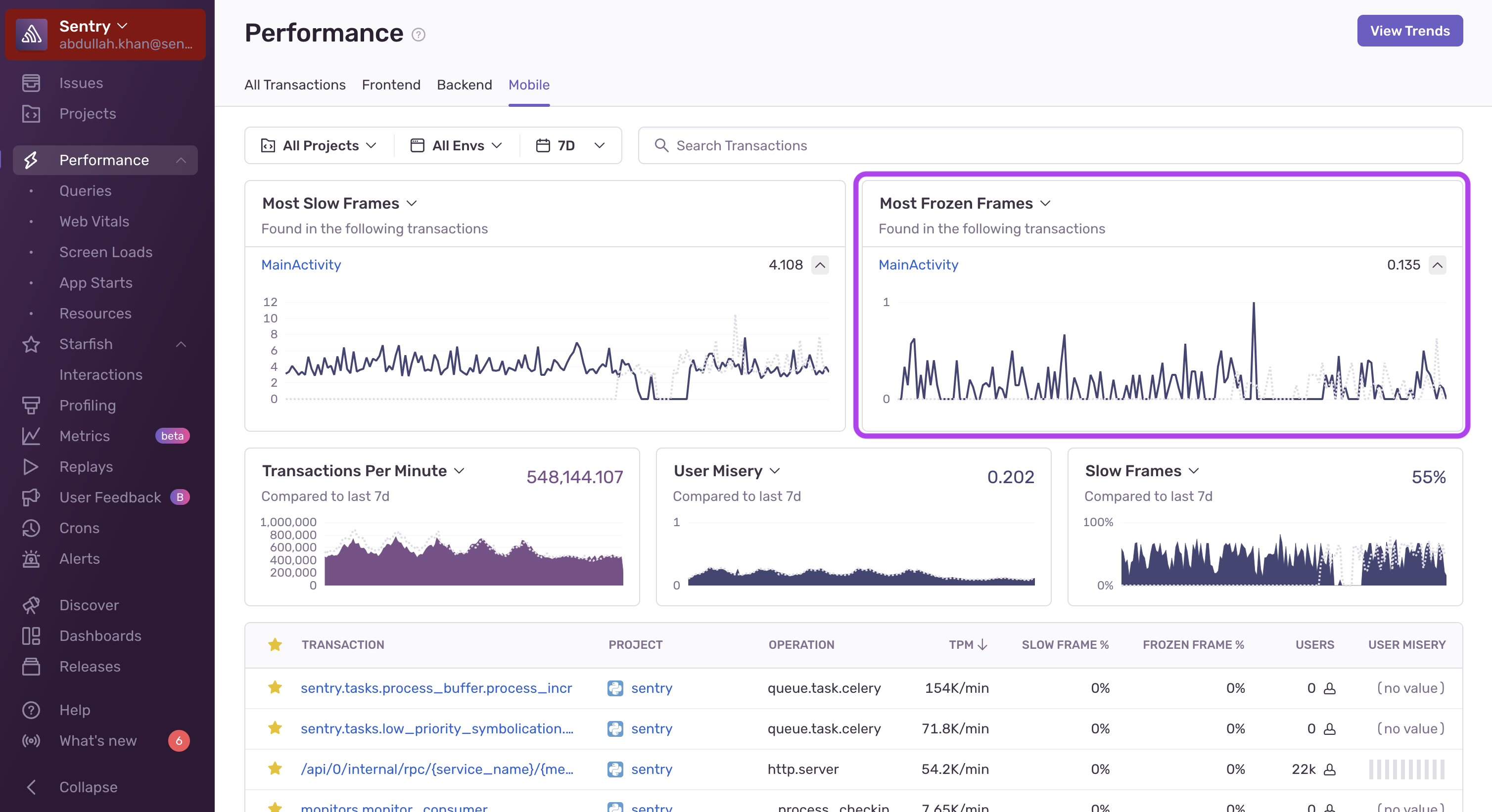 Shows transactions with the most frozen frames for mobile projects. Learn more in Mobile Vitals.